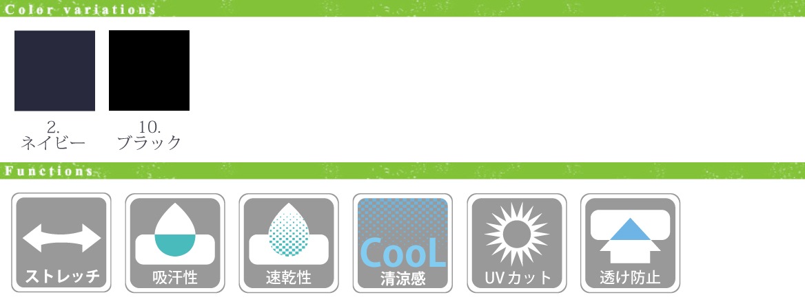 - ■ 仕様/ニット、2wayストレッチ、吸汗、速乾、吸放湿、接触冷感、UVカット、透けにくい、サステイナブル