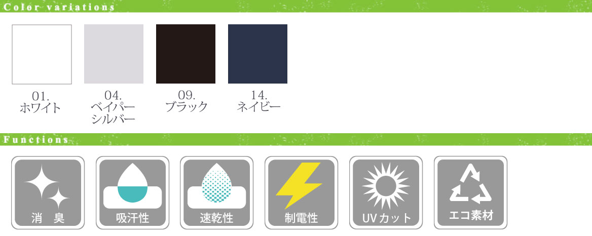 - ■ 機能/制電、吸汗速乾、消臭、ストレッチ