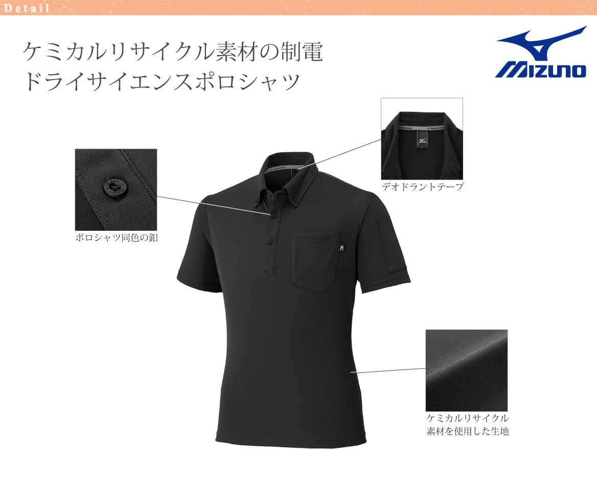 - ■ 仕様/ドライサイエンス、ケミカルリサイクル素材を使用した生地、静電気帯電防止生地、UPF50+、ミズノデオドラント消臭