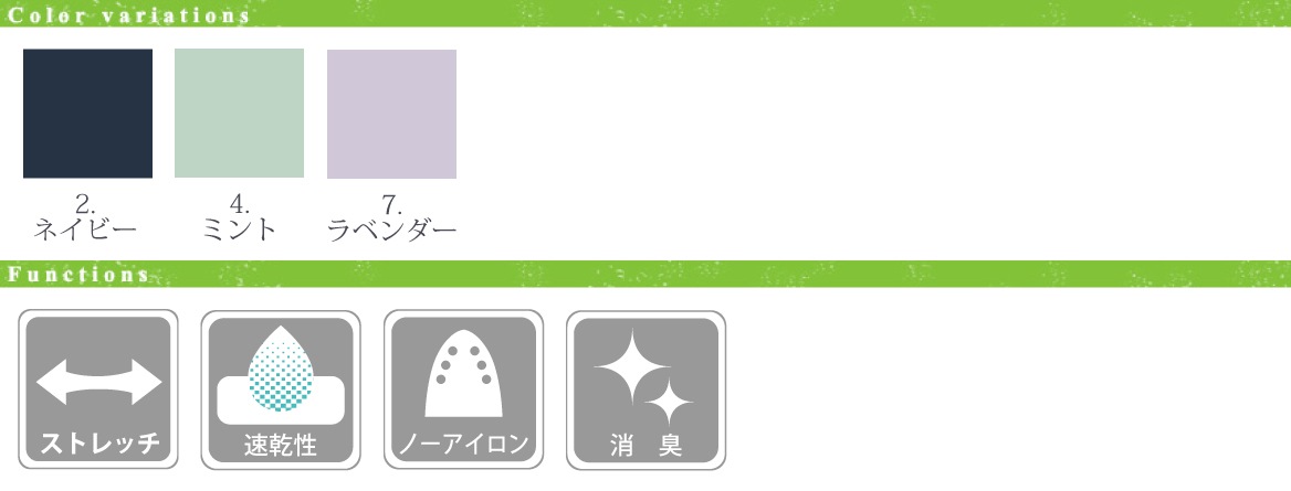 - ■ 仕様/肌ざわり、ストレッチ、ドレープ性、速乾、イージーケア