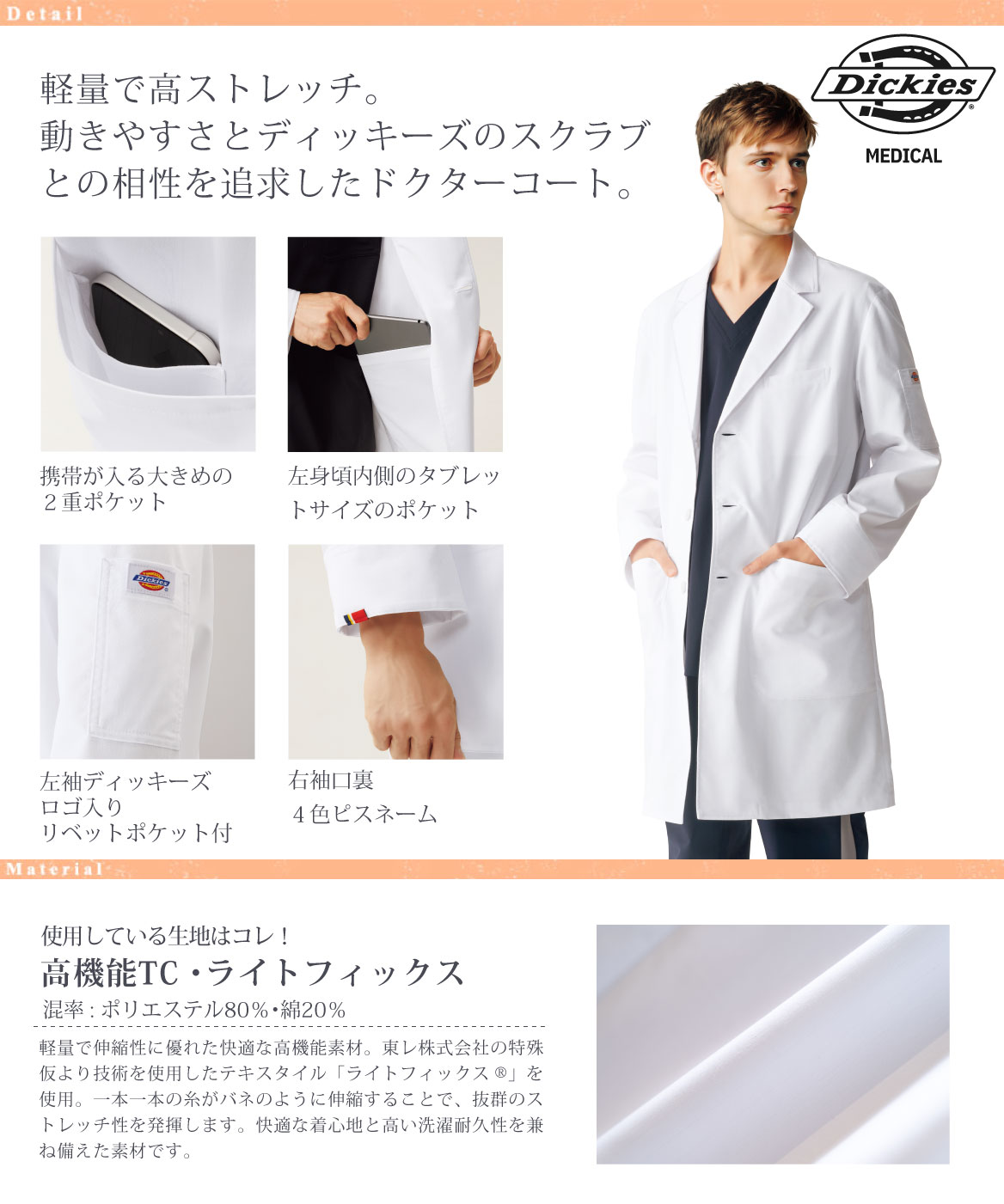 V開きの襟元はDickiesスクラブとの相性抜群で、後ろベンツ仕様により動きやすさや足さばきにも配慮。